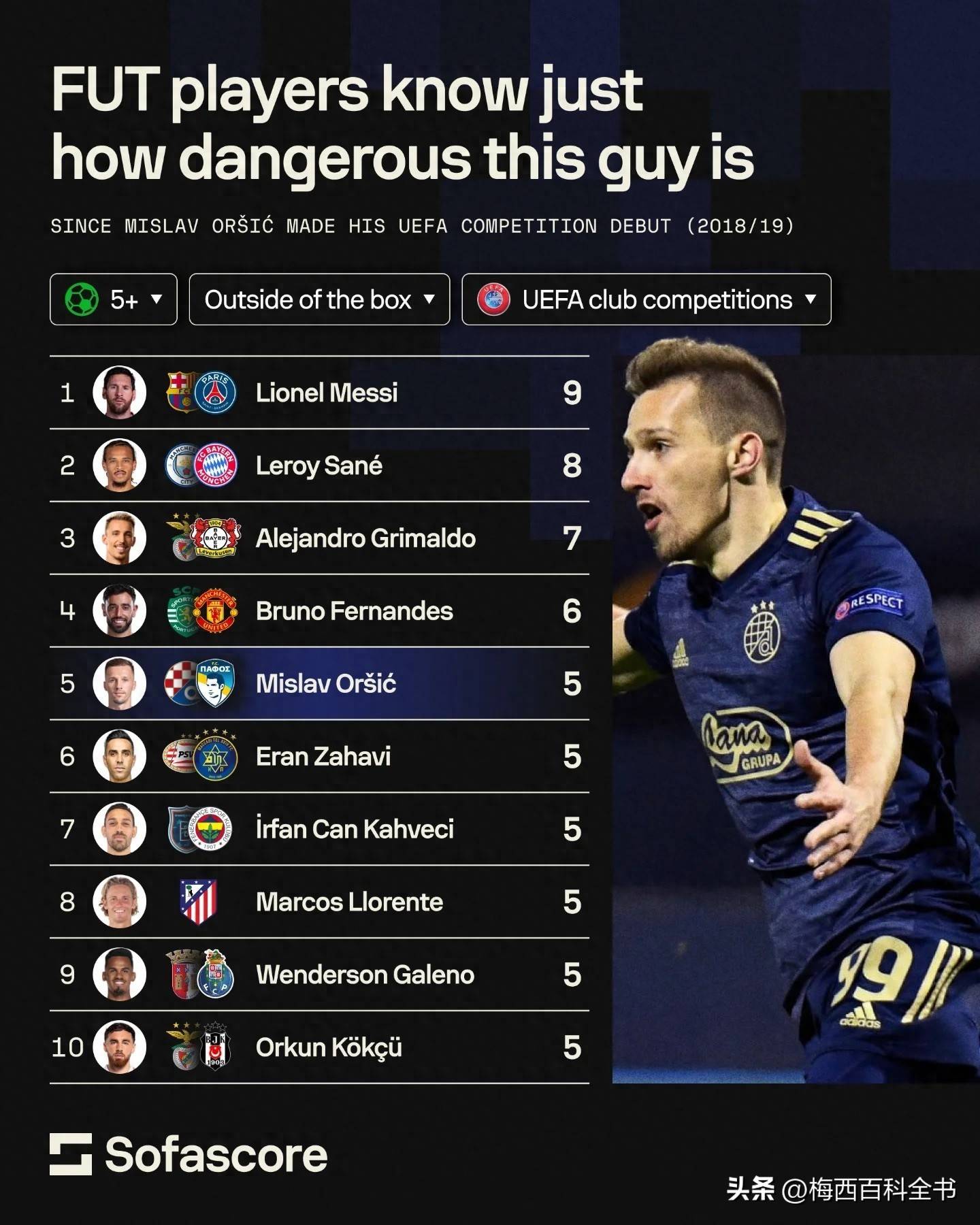 不仅如此,Sofascore还特别定制了一份过去八个赛季的欧冠禁区外远射进球榜,米斯拉夫·奥尔西奇以5粒进球追平了前十的门槛,与扎哈维、卡赫韦奇、略伦特、加来诺、柯克曲并列。B费以6球排名第四,亚历杭德罗·格里马尔多以7球位列第三,萨内则以8球排名第二。而高居榜首的,依旧是梅西,他以9粒禁区外远射宣告着自己在这项技术上的统治力。值得注意的是,C罗甚至未能达到5球的门槛。